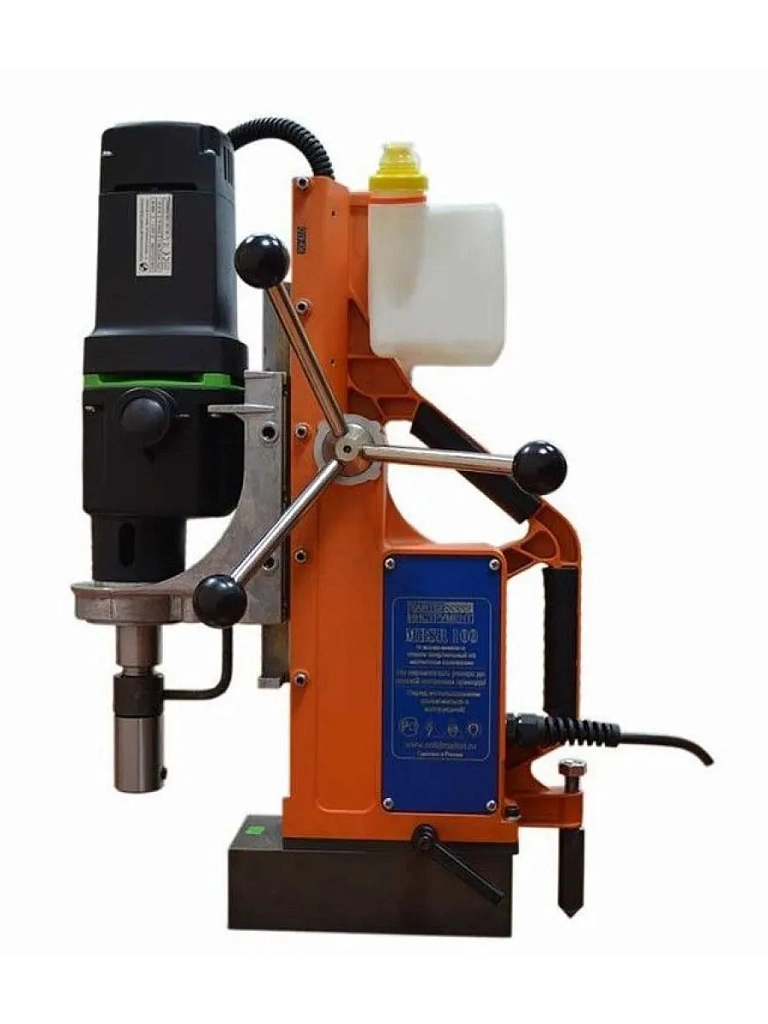 Сверлильно-резьбонарезной станок на электромагнитном штативе MBSR-100 арт. 210 09 обладает не только мощным приводом с плавным пуском и двухскоростной коробкой передач, но и подвижным магнитным основанием для точной настройки положения оси сверления в труднодоступных и неудобных местах. Главной особенностью данной модели, отличающей её от похожих станков, как нашего, так и зарубежного производства, назовем наличие двойных направляющих типа ласточкин хвост. Это позволяет расширить доступный диапазон хода сверла до немыслимых прежде 320 мм. Все это при сохранении компактных размеров и сравнительно небольшой массы.