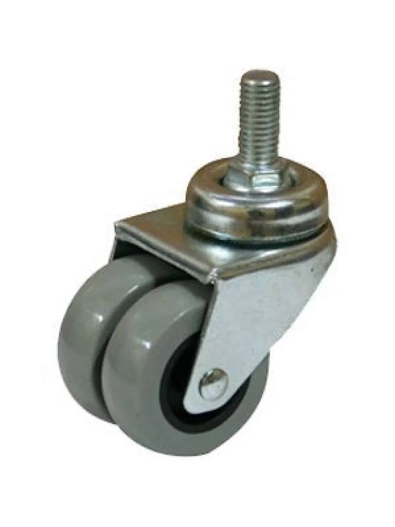 Сдвоенные мебельные колеса из полиуретана с полипропиленовым ободом и различным типом крепления – разновидность мебельных колесных опор, которая применяется в составе предметов как офисного, так и домашнего интерьера. Наличие поворотной опоры дает возможность движения по любой траектории. Конструкция включает подшипник скольжения. Основные особенности – наличие парных соосных колес в каждой единице этих изделий и серый цвет их шинки.