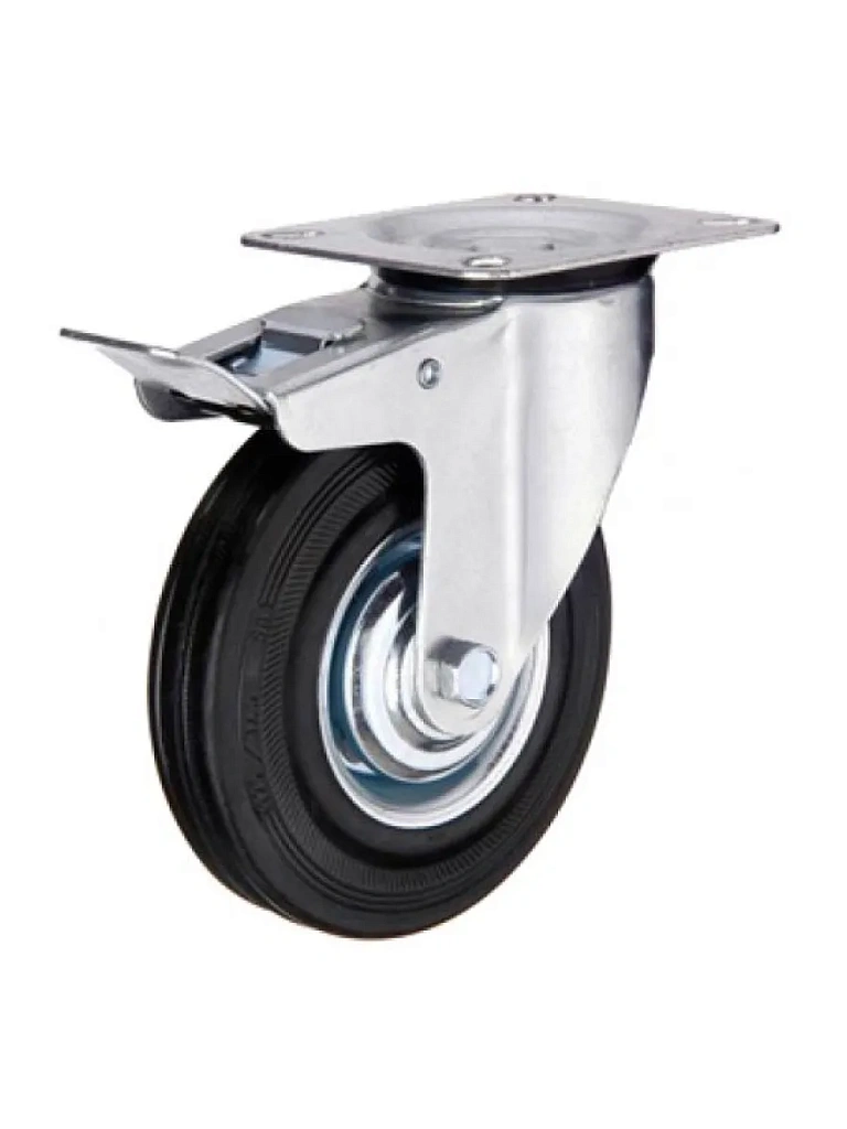Обод поворотного колеса изготовлен из высокопрочной стали и оцинкован. Сама шина колеса выполнена из черной резины высокого качества, которая справляется с различными воздействиями внешней среды и поглощает вибрации и шум.