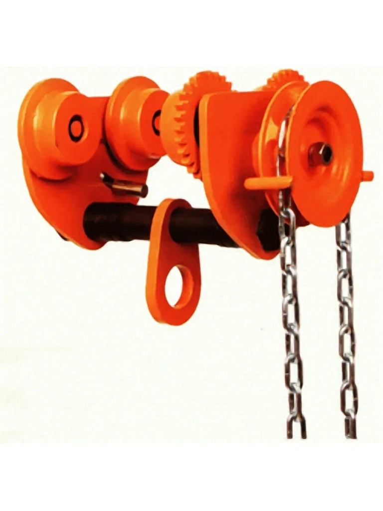 Такая тележка состоит из двух металлических щек, скрепленных между собой болтами, роликов, предназначенных для фиксации устройства на монорельсе и обеспечивающих плавный ход, цепи и механизма, управляющего движением (сочетание редуктора и приводного колеса).