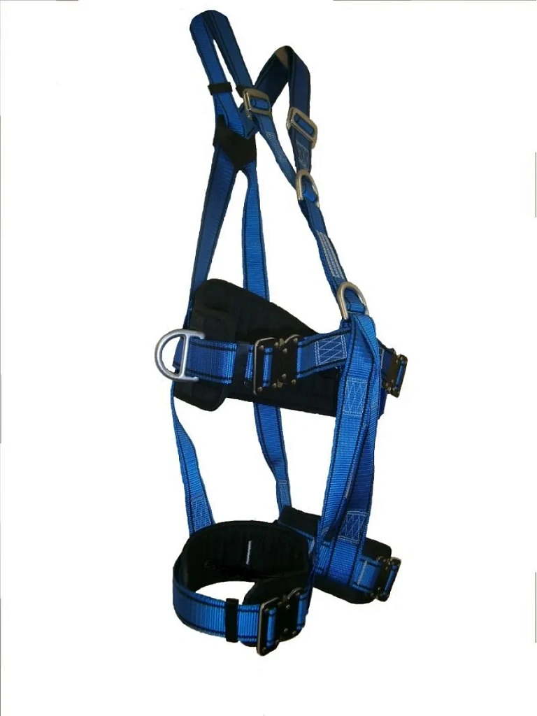 Имеет пять точек крепления: две боковые точки крепления на поясе для работы в подпоре, спинная и грудная точки крепления предназначены для присоединения к системе защиты от падения.