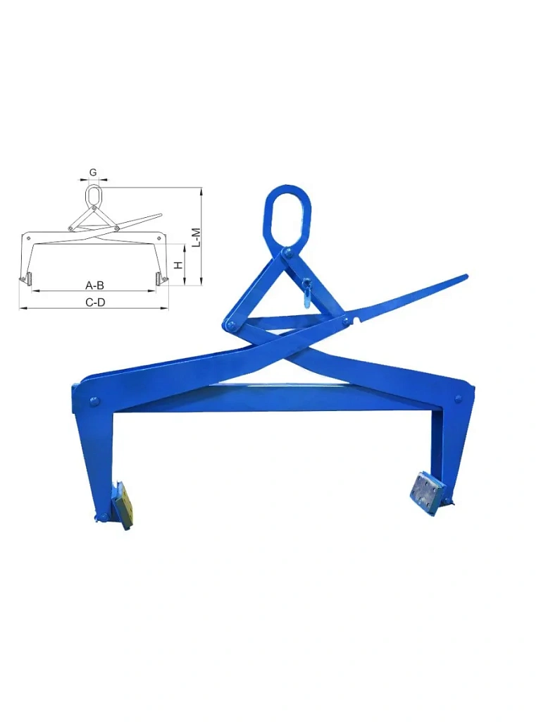 Захват представляет собой механизм клещевого типа, удержание груза осуществляется за счет силы трения между поверхностью груза и щеками захвата. Конструкция захвата позволяет надежно закрепить бордюрные камни, бетонные блоки и аналогичные грузы длиной до 1060мм, грузоподъемность одного захвата составляет до 0,5т.