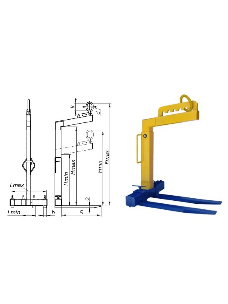 Отличительной особенностью захвата является возможность регулирования расстояния между вилами и высоты захвата, что позволяет ему работать с широкой номенклатурой грузов. Предусмотренное переставное звено, позволяет подобрать обратный наклон вил, для предотвращения «схода» поддона при транспортировке.