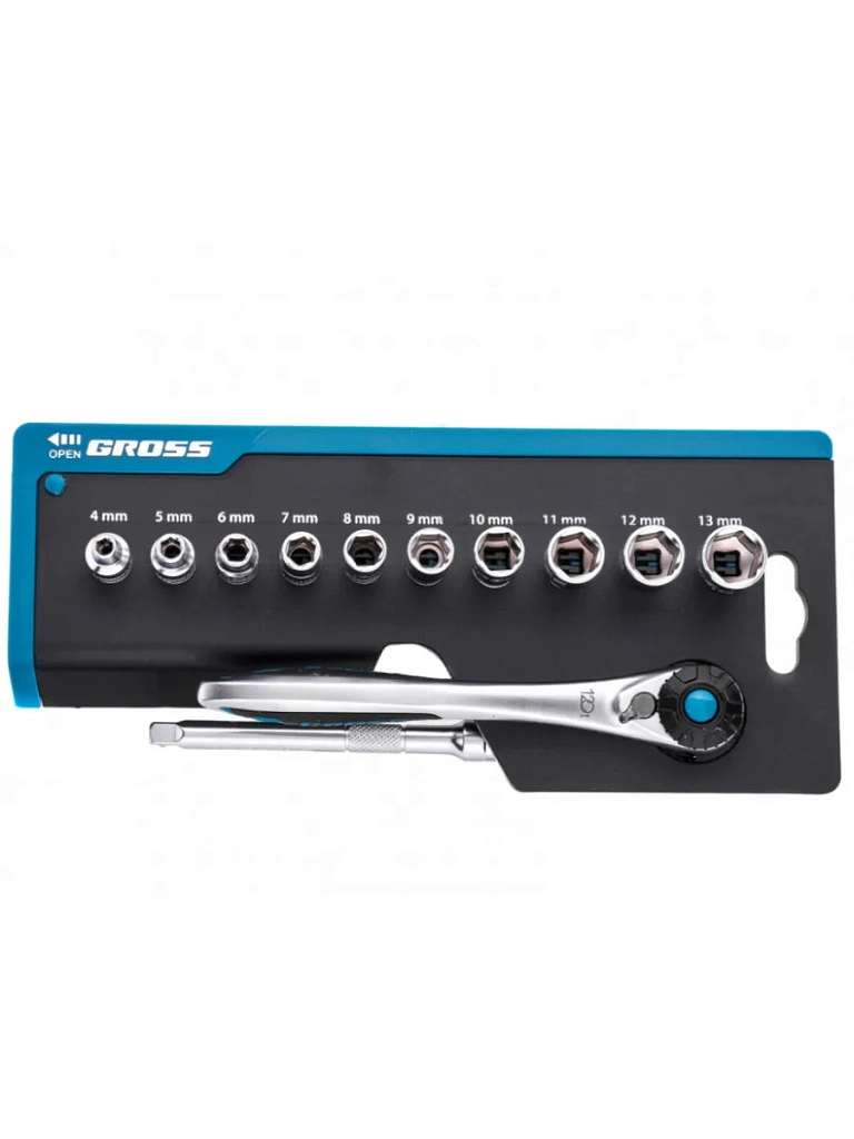 Набор торцевых головок, трещотка 120 зубьев, 12 предметов GROSS 14141 предназначен для слесарно-монтажных работ. Может использоваться автолюбителями и на станциях технического обслуживания автомобилей, подойдет для ремонтных работ в быту. Торцевые головки и трещотка выполнены из высокопрочной хромванадиевой стали, которая выдерживает интенсивные нагрузки и имеет продолжительный ресурс работы. Трещотка оснащена 120 зубьями, обеспечивает в работе мягкость и плавность. Шаг зуба составляет 3 градуса. Пластиковый кейс, в котором поставляется набор, обеспечивает компактное хранение инструментов и удобство их транспортировки.