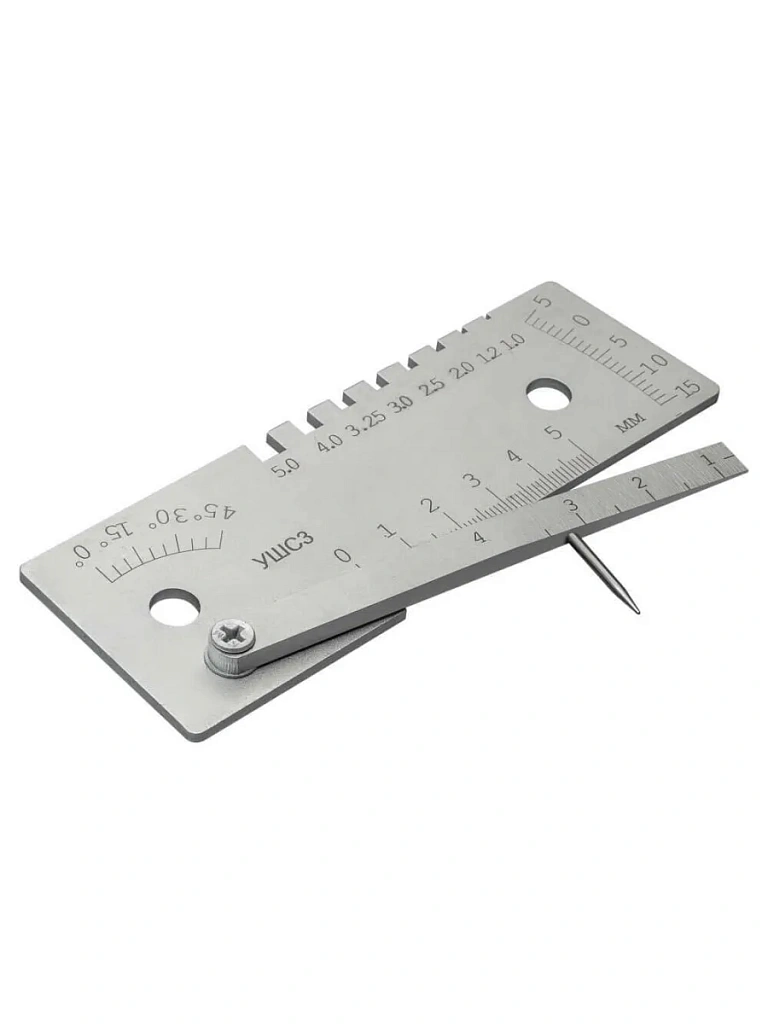 Универсальный шаблон сварщика УШС-3 предназначен для контроля качества сварных швов и позволяет определять параметры дефектов, таких как забоины, зазоры, притупления, углы скоса и превышения кромок.