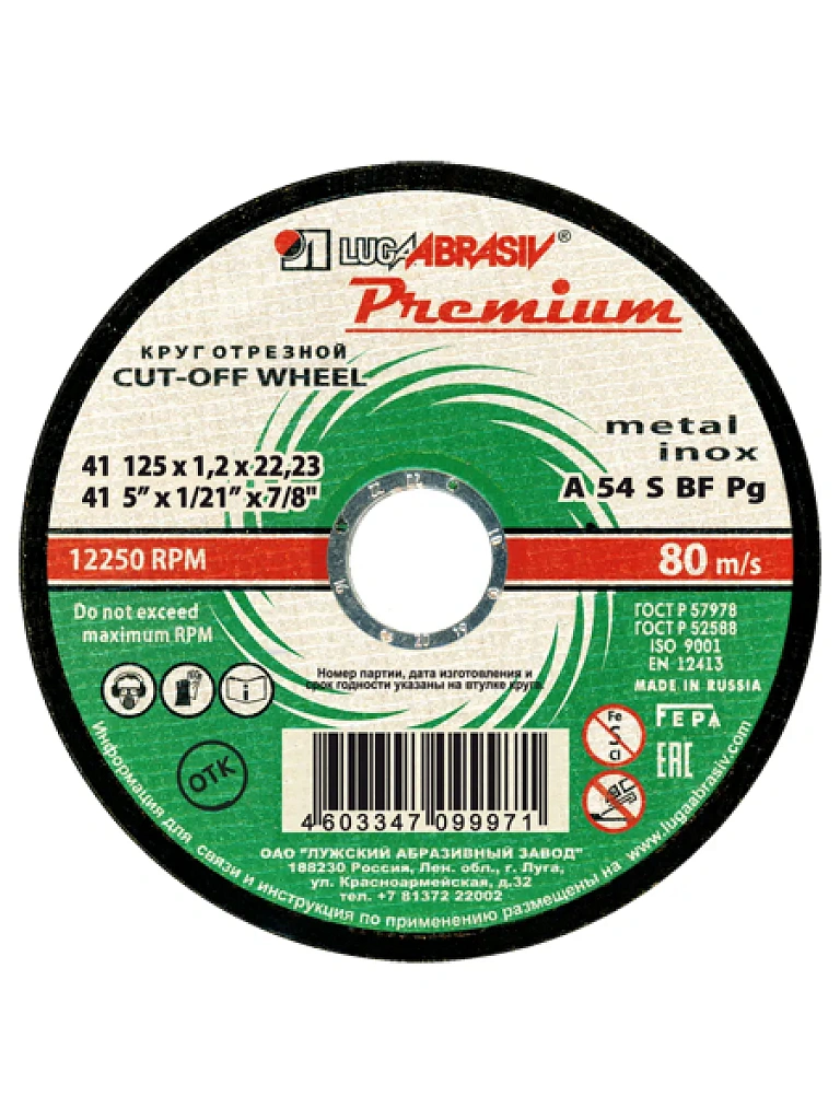 Внешний диаметр диска соответствует 125 мм. Изготовлена оснастка из электрокорунда, а основой для нее послужила бакелитовая связка с наличием армирования. Это позволяет аксессуару приобрести максимальную устойчивость к деформации в процессе резания. Сплошной диск не содержит компенсационных отверстий и рекомендуется для работы при скорости, не превышающей 12250 оборотов в минуту.