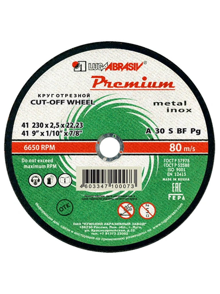 Внешний диаметр диска соответствует 230 мм. Изготовлена оснастка из электрокорунда, а основой для нее послужила бакелитовая связка с наличием армирования. Это позволяет аксессуару приобрести максимальную устойчивость к деформации в процессе резания. Сплошной диск не содержит компенсационных отверстий и рекомендуется для работы при скорости, не превышающей 6650 оборотов в минуту.
