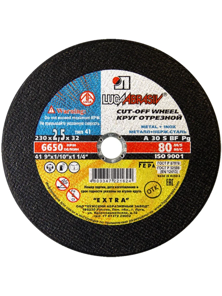 Круг отрезной армированный изготовлен из электрокорунда нормального марки 14А на основе бакелитовой связки с армированием. Используется на УШМ, соответствующего типоразмера и предназначен для резки деталей и конструкций из различных марок сталей.