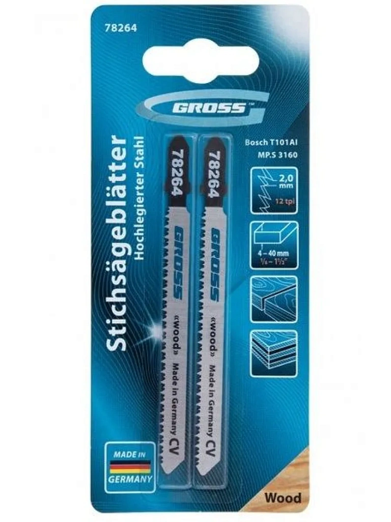 Полотно для электролобзика торговой марки GROSS изготовлено из высококачественной инструментальной немецкой стали и предназначено для распила заготовок из древесины мягких пород, а также ДВП, ДСП и прочих композитных материалов, основу которых составляет дерево. Полотно длиной 100 мм и толщиной 1,45 мм с шагом зуба 12 TPI позволяет пилить изделия толщиной от 3 до 60 мм. Место распила с обеих сторон имеет аккуратную и ровную кромку благодаря отшлифованной под конус боковой поверхности полотна.