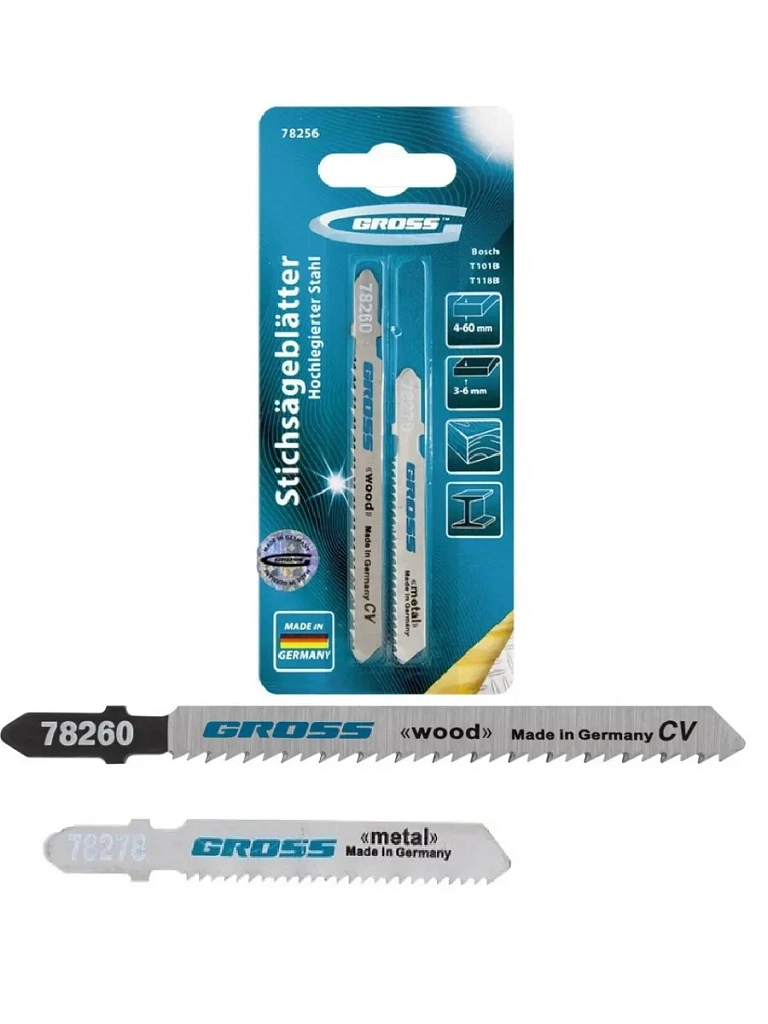 Полотна для электролобзиков GROSS — это высокотехнологичный продукт немецкой инструментальной промышленности. Материалом для них служат европейские инструментальные стали наивысшего качества. В технологическом процессе используется лазерный раскрой профиля, полностью автоматизированное оборудование для заточки и шлифовки. Высокое качество обеспечивается автономными электронными модулями контроля геометрических и физических параметров. Полотна обладают высоким качеством реза, стойкостью к износу. Соответствуют всем сертификатам по безопасности.