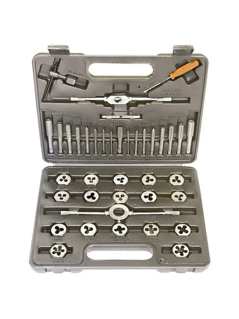 Набор метчиков и плашек является универсальным и используется для нарезания как внешней, так и внутренней резьбы (от М3 до М12). Кроме метчиков и плашек в набор также входят воротки для метчиков и плашкодержатели.