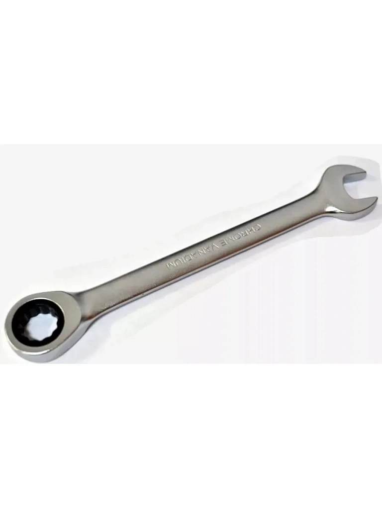 Комбинированный гаечный ключ с двумя рабочими профилями: рожковым с открытым зевом и накидным с трещоточным механизмом.