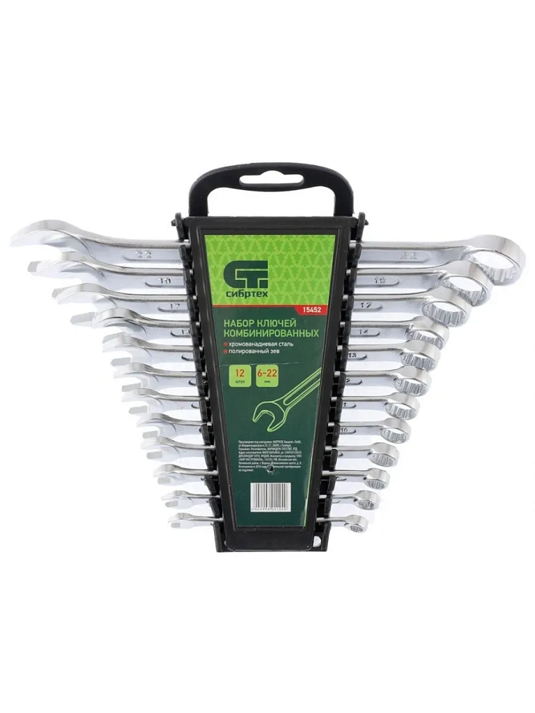 Ключи изготовлены из хромванадиевой стали. Твердость материала рабочей части ключа 45 HRc (требования ГОСТ – 45–51 HRc). Ключи имеют хромированное покрытие. Профиль кольцевого зева имеет 12 граней, что увеличивает площадь соприкосновения рабочих поверхностей и снижает риск деформации граней крепежа при монтаже. Угол наклона кольцевого зева относительно плоскости ключа в 15 градусов делает монтаж более удобным. Ключи поставляются в комплекте с трапециевидным пластмассовым держателем. Набор предназначен для монтажа демонтажа резьбовых соединений.