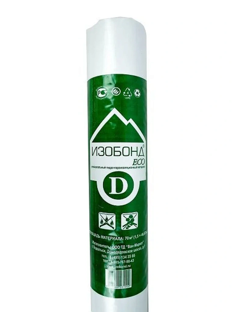 ИЗОБОНД D ECO – универсальный, двухслойный, паронепроницаемый, гидро-пароизоляционный материал, изготовленный из полипропиленового тканого материала, ламинированного с одной стороны полипропиленовой (полиэтиленовой) пленкой. Данный материал применяется для защиты теплоизоляционного слоя и конструктивных элементов здания (сооружения) от проникновения атмосферной влаги, подкровельного конденсата, а также ветра и снега, проникающих в местах неплотной укладки кровли. ИЗОБОНД D ECO можно применять в качестве гидроизоляции в конструкции полов по бетонным основаниям.
