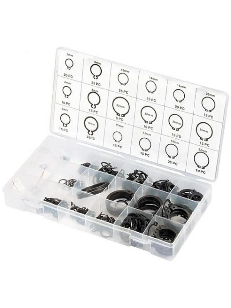 Набор стопорных колец имеет в своем комплекте изделия, которые служат для предотвращения смещения деталей относительно друг друга.