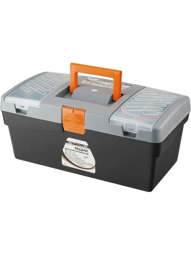 Инструментальный ящик с дополнительными секциями. Ящик размером 42х22х18см (17") изготовлен из полипропилена, имеет два встроенных органайзера с крышкой и съемный 3-х секционный лоток Предназначен для хранения и транспортировки инструмента, расходных материалов и крепежных изделий, а также любых сходных по габаритам бытовых товаров.