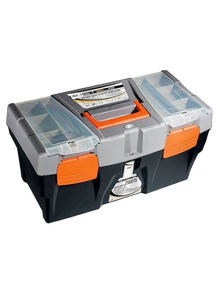 Инструментальный ящик с дополнительными секциями. Ящик размером 50х26х26см (20") изготовлен из полипропилена, имеет два встроенных органайзера с крышкой и съемный 3-х секционный лоток. Предназначен для хранения и транспортировки инструмента, расходных материалов и крепежных изделий, а также любых сходных по габаритам бытовых товаров.