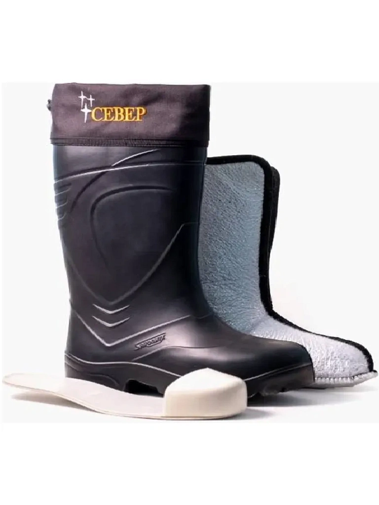 Сапоги мужские из ЭВА с термовкладышем t до - 40°C (р.43-44) выполнены из современного материала ЭВА с комбинированной надставкой, с защитным полимерным подноском и стелькой, с двухслойным вкладным утеплителем из нетканного ворсового полотна с фольгированной прослойкой и искусственного меха с добавлением волокон натуральной шерсти. Обувь изготовлена методом однокомпонентного литья под давлением. Предназначена для применения в условиях агрессивных сред и пониженных температур, защиты ног от воды, Обладают легкостью (вес 1 пары 700 грамм).