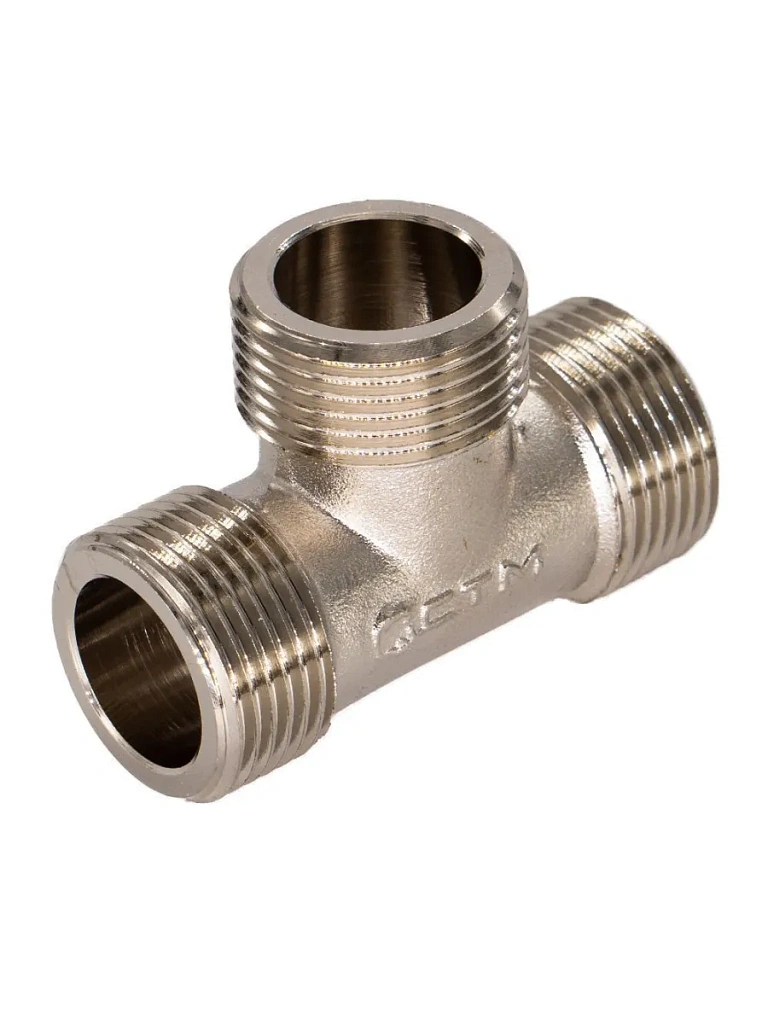 Тройник с наружной резьбой - трёхсторонний резьбовой фитинг. Предназначается для соединения частей трубопровода. Тройник изготавливается из высококачественной горячепрессованной латуни. Никелированное покрытие тройника даёт дополнительный запас прочности. Никелирование предотвращает появление коррозии, а также защищает от механического износа и вредного воздействия агрессивных жидкостей и воздушно-газовых сред. Резьба тройника нарезается на станке с ЧПУ. Наружная резьба тройника оснащена насечками, обеспечивающими лучшее сцепление с уплотнительным материалом при монтаже.