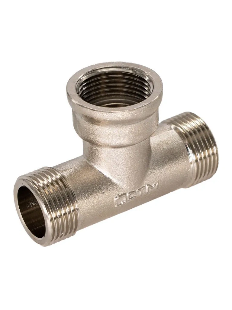 Тройник с наружной/внутренней/наружной резьбой - трёхсторонний резьбовой фитинг. Предназначается для соединения частей трубопровода. Тройник изготавливается из высококачественной горячепрессованной латуни. Никелированное покрытие тройника даёт дополнительный запас прочности. Никелирование предотвращает появление коррозии, а также защищает от механического износа и вредного воздействия агрессивных жидкостей и воздушно-газовых сред. Резьба тройника нарезается на станке с ЧПУ. Наружная резьба тройника оснащена насечками, обеспечивающими лучшее сцепление с уплотнительным материалом при монтаже.