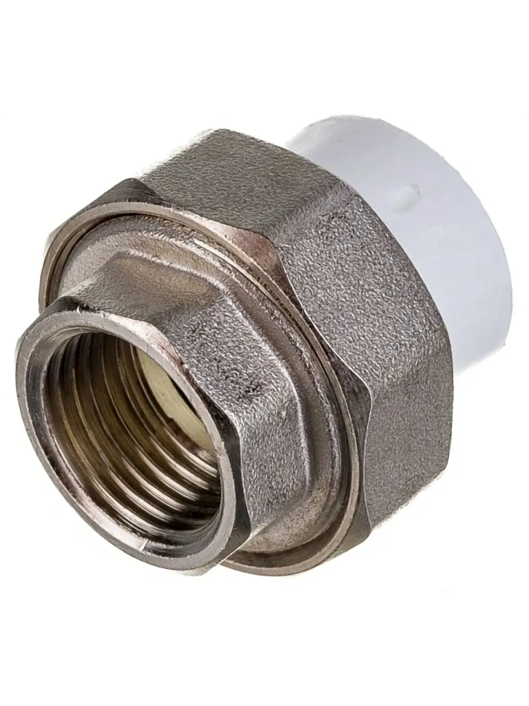 Комбинированный полипропиленовый фитинг, закладная деталь изготовлена из латуни марки ЛС-59-1. Представляет собой разъемное соединение между металлической и пластиковой трубой. Латунные части производятся методом горячего штампования, пластиковые - методом литья под давлением.