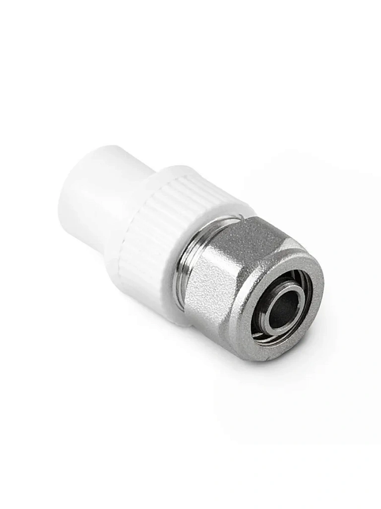 Данный переходник позволяет соединить трубы из рандомсополимера полипропилена с трубами из PE-RT, PEX, металлопластиковыми трубами. С одной стороны переходник имеет полипропиленовый хвостовик, который может быть вварен в раструб фитинга PP-R с помощью стандартного сварочного аппарата. С другой стороны адаптер представлят собой компрессионное соединение, которое соединяется с металлопластиковой трубой или трубой из сшитого полиэтилена механическим способ с помощью гаечного ключа.