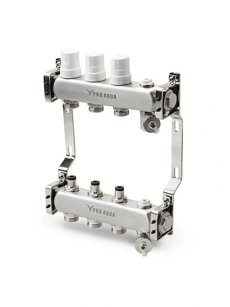 Новые коллекторные блоки Pro Aqua – это эффективное решение для организации системы отопления и теплого пола. Блоки произведены из нержавеющей стали марки AISI 304, которая является одним из самых экологичных материалов. Толщина стенки коллекторного блока Pro Aqua увеличена и составляет 1,6 мм, стандарт 1,5 мм. Коллекторные блоки имеют увеличенное проходное сечение 40x40.7 мм (16.28 см2) и обладают повышенной пропускной способностью.
