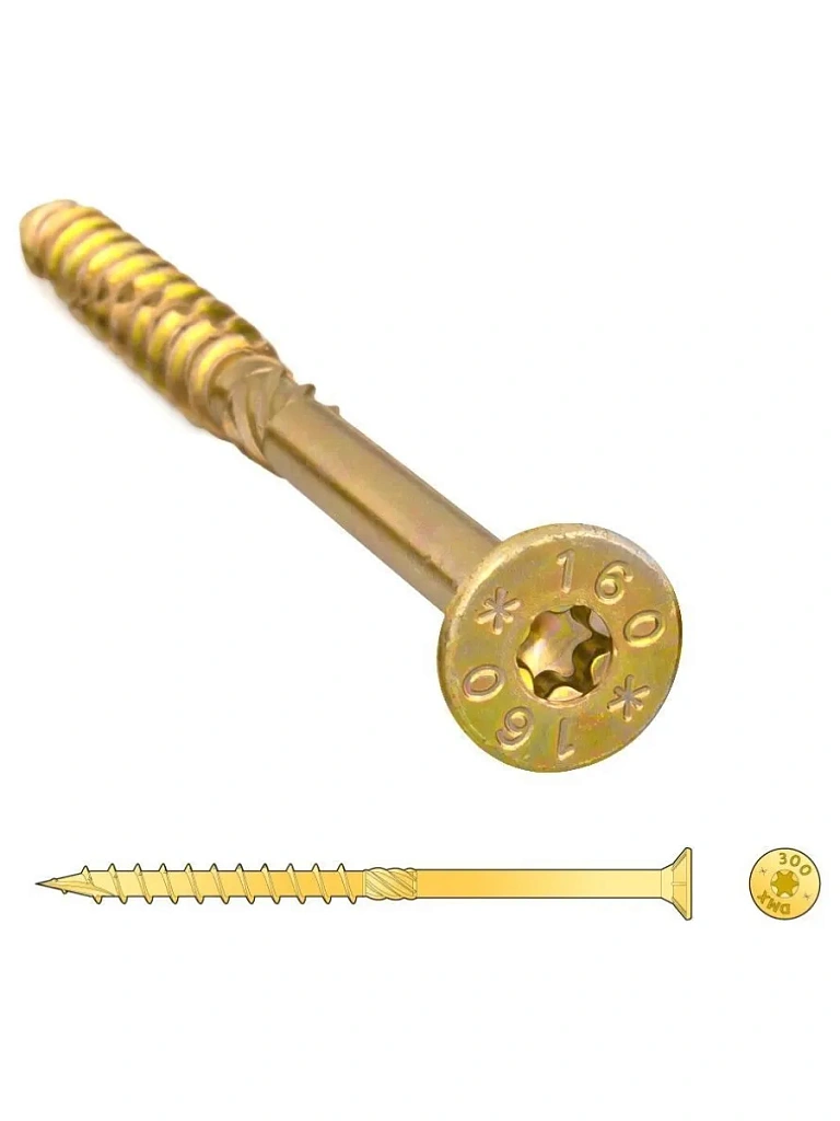 Конструкционный саморез с потайной головкой позволяет быстро строить из дерева, выполняя в одно движение засверливание, вкручивание и зенковку шрупа. При этом раскалыванию основания препятствует специальная конструкция самореза, включающая специальные насечки на резыбе для перемалывания стружки и турбину для расширения отверстия.
