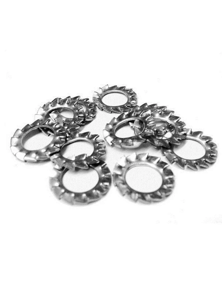 Стопорная шайба с зубьями DIN 6798 A используется для стопорения резьбовых соединений в различных областях машиностроения. Буква А в маркировке шайбы обозначает, что зубцы находятся на внешней стороне диска. Благодаря зубцам стопорная шайба максимально тесно прилегает к поверхности материала, что исключает проворот соединения и его ослабление под действием вибрации. Благодаря этому свойству шайба с внешними зубьями DIN 6798 A используется при производстве механизмов. При необходимости сохранить целостность покрытия под шайбу с зубьями может подкладываться обычная плоская шайба. По своим характеристикам шайба с зубьями соответствует российскому стандарту ГОСТ 10463.