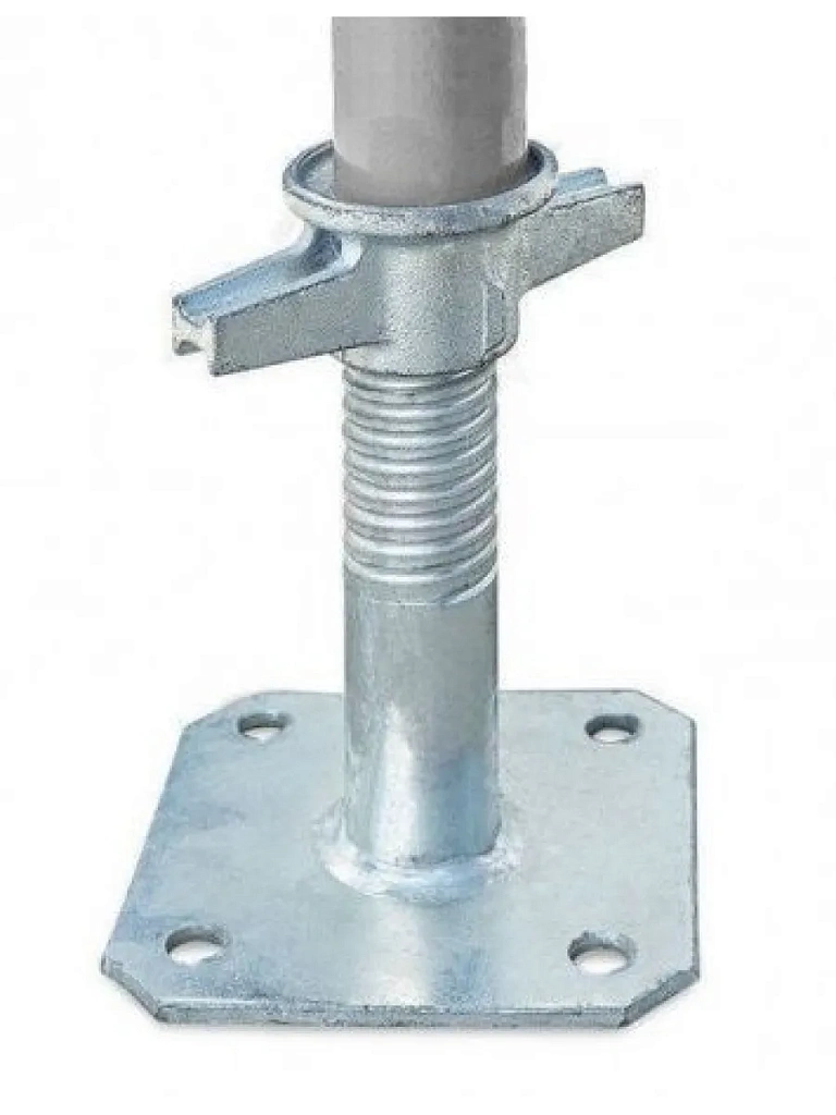 Винтовая опора используется при установке рамных или хомутовых лесов. При больших перепадах высоты (неровностях) поверхности на которую устанавливаются рамы лесов берутся винтовые опоры нужной высоты. С помощью них можно выровнять нижний ярус лесов для правильной дальнейшей сборки всей конструкции.