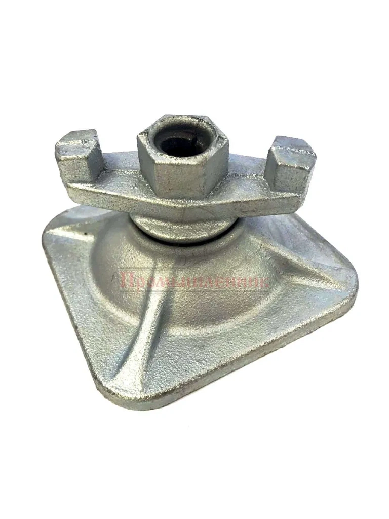 Шарнирная гайка суперплита для стяжного болта, с резьбой М17, применяется в монолитном строительстве, как одна из комплектующих приспособлений для опалубочных систем. Используется вместе со стяжным винтом. Гайка имеет опорную площадку размером 120х120 мм, что позволяет производить зажим панелей опалубки прочно и надежна. Плита не позволяет разойтись панелям под давлением цементной смеси.