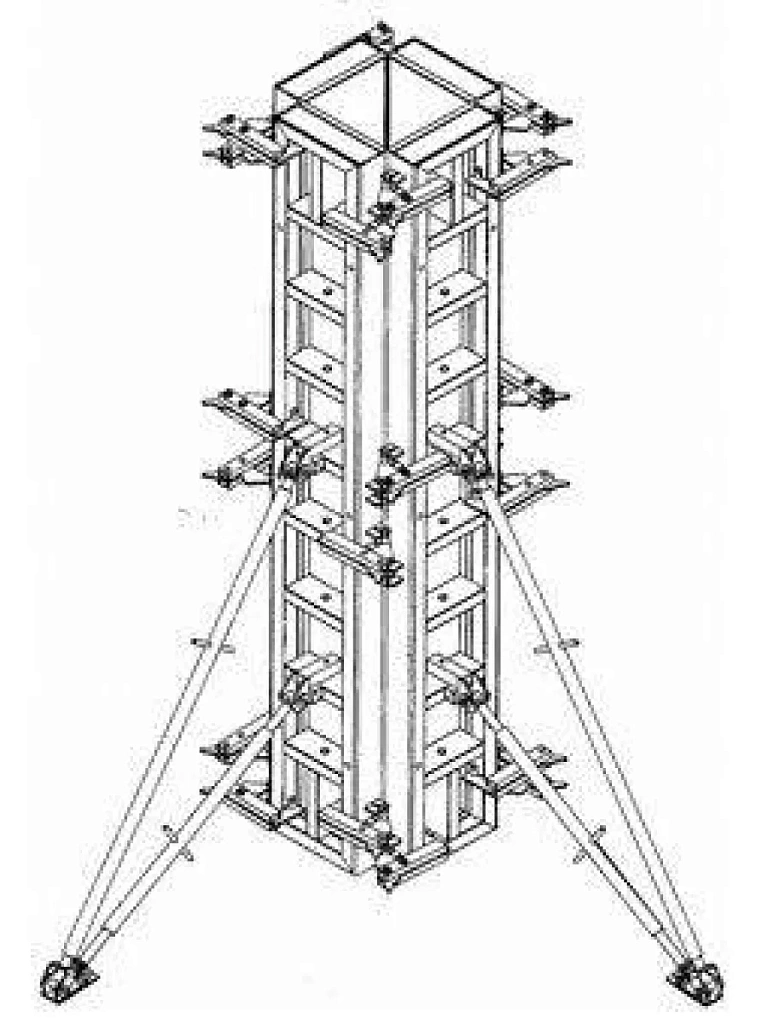 Опалубка колонн оборудована подкосами для установки, рихтовки, распалубки и навесными подмостями с ограждениями для приемки бетона.