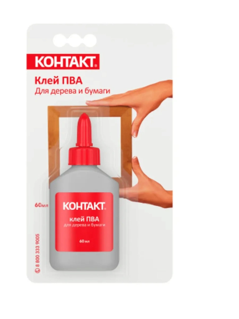 Клей ПВА Контакт 60 мл 12055 готов к применению и служит для склеивания бумаги, картона и заготовок из дерева. Состав вещества имеет водную основу, тем самым его можно легко смыть с рук после использования. Удобная емкость с дозатором облегчает применение и нанесение клея.