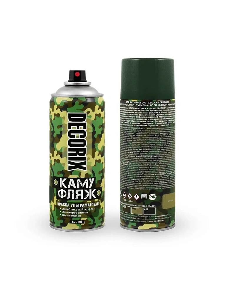 Высококачественная ультраматовая краска камуфляжная предназначена для маскировочного окрашивания военно-спортивного, рыболовно-охотничьего и экспедиционного снаряжений, укрытий и вышек, лодок, вездеходов, квадроциклов, внедорожников и другой техники. Образует ультраматовую поверхность со светопоглощающим эффектом, идеально подходящую для камуфляжа. При правильно подобранных сочетаниях и площади закрашивания цветов краска максимально маскирует объекты на местности. Для создания камуфляжа используйте листья и ветки в качестве трафарета. Аэрозольная краска удобна для локального окрашивания и окрашивания труднодоступных мест.
