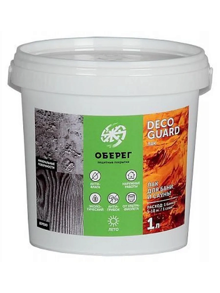 Лак для бани и сауны DecoGuard - водно-дисперсионный термоустойчивый лак предназначен для декоративной отделки и защиты деревянных поверхностей внутри бань и саун (скамейки только в предбаннике), а также защиты и декорирования поверхностей из кирпича, керамики, бетона, природного и искусственного камня и других минеральных поверхностей внутри моечных помещений.