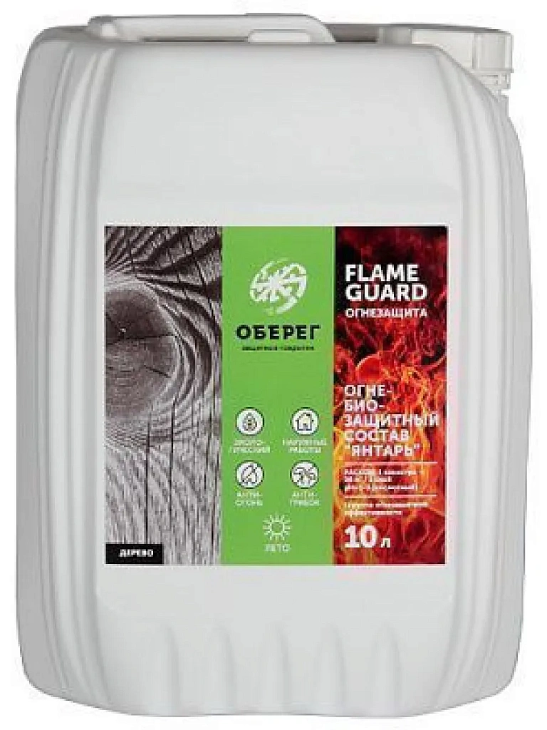 FlameGuard Огнебиозащитный состав Янтарь зимний предназначен для огнезащиты деревянных конструкций, древесины и материалов на её основе (ДСП, ДВП, фанеры и т.п. ). Огнезащита древесины составом Янтарь обеспечивает выполнение требований I и II группы огнезащитной эффективности по ГОСТ Р 53292-2009.