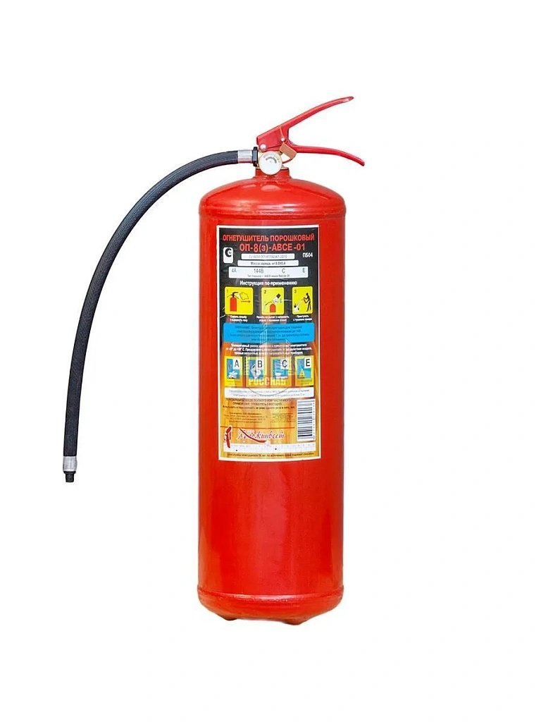 Порошковый огнетушитель ОП-8 относится к классу универсальных закачных переносных огнетушащих средств. Цифра восемь означает массу огнетушащего порошка в килограммах. Данный вид огнетушителя возможно использовать на площади до 80 квадратных метров, а длина струи из раструба выброшенного порошка может достигать до четырех метров. Время непрерывной работы до 10 секунд. Общий вес баллона 11,5 кг. ОП-8 можно тушить твердые, горючее жидкости, нефтепродукты, газы, а так же электрооборудование до 1000 Вольт.